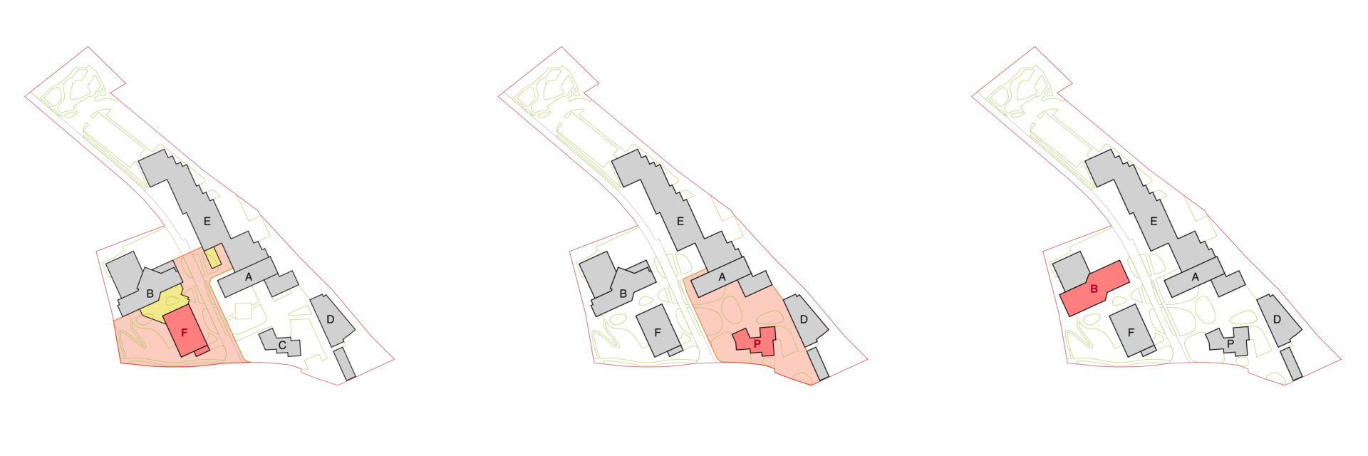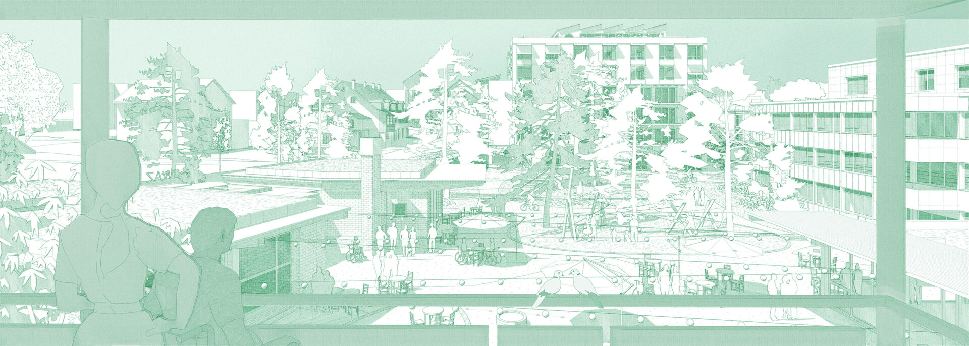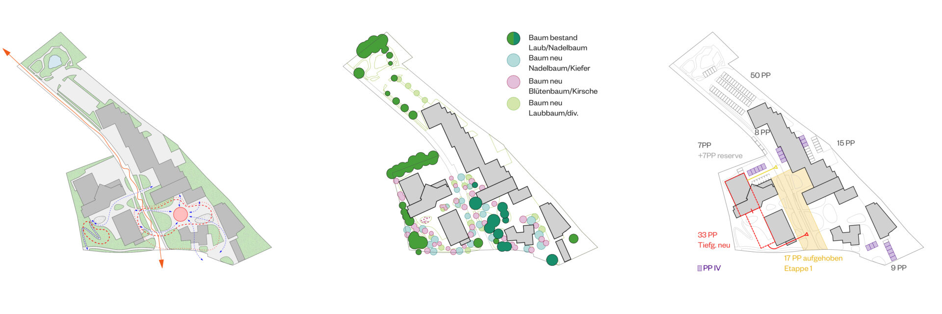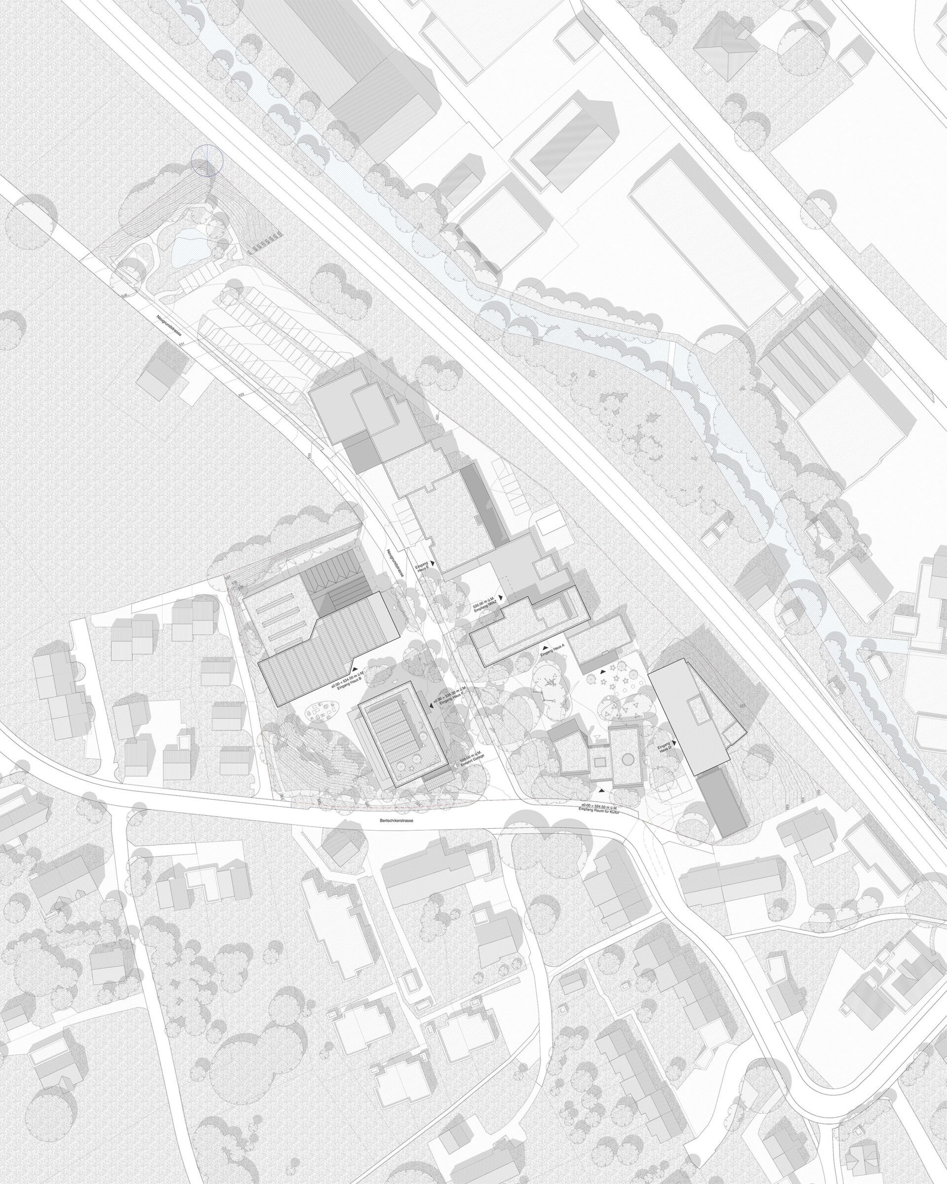 Von Wetzikon herkommend begrüsst einen der neue, einladende Pavillon – eine klar erkennbare Adresse an der Bertschikerstrasse. Von Weitem ist der alte Baumstand und das neue, mächtige Haus F zu sehen. Durch den Pavillon hindurch oder an ihm vorbei erreicht man den zentralen Platz, auf dem alle Fäden zusammenlaufen.