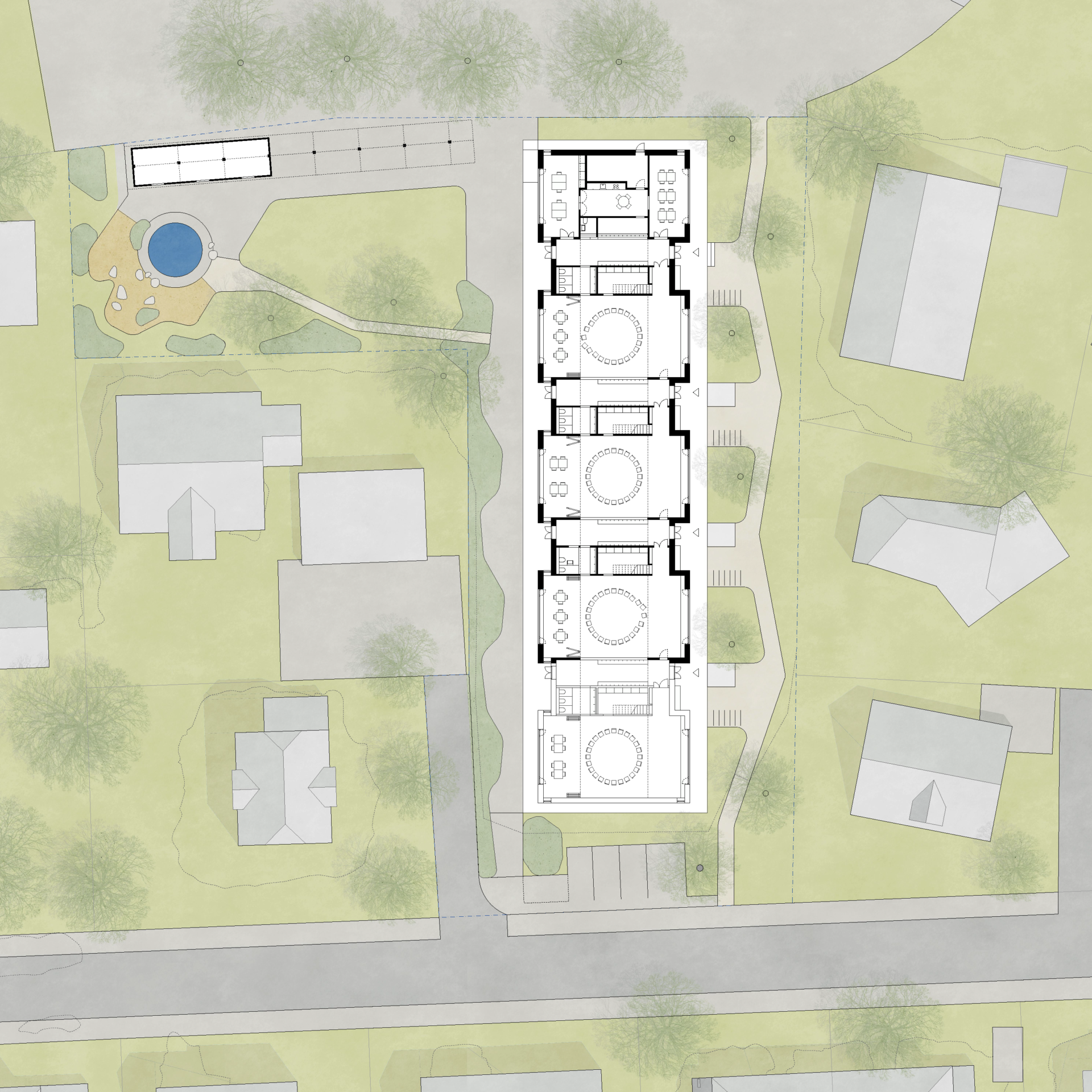 The building floats above the ground. No extensive earthworks are necessary, and the terrain is disturbed as little as possible, with the new structure partially adopting the footprint of the existing pavilions.