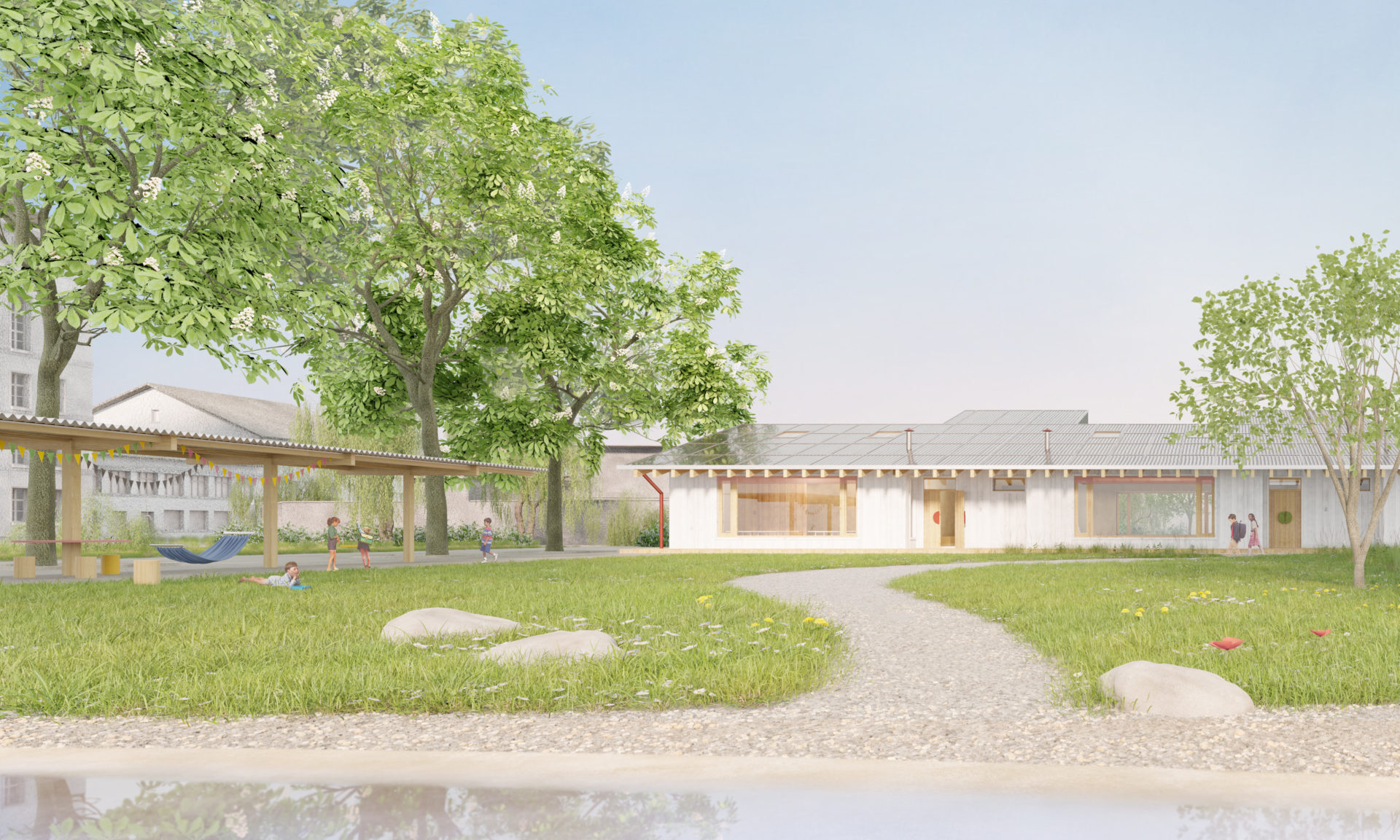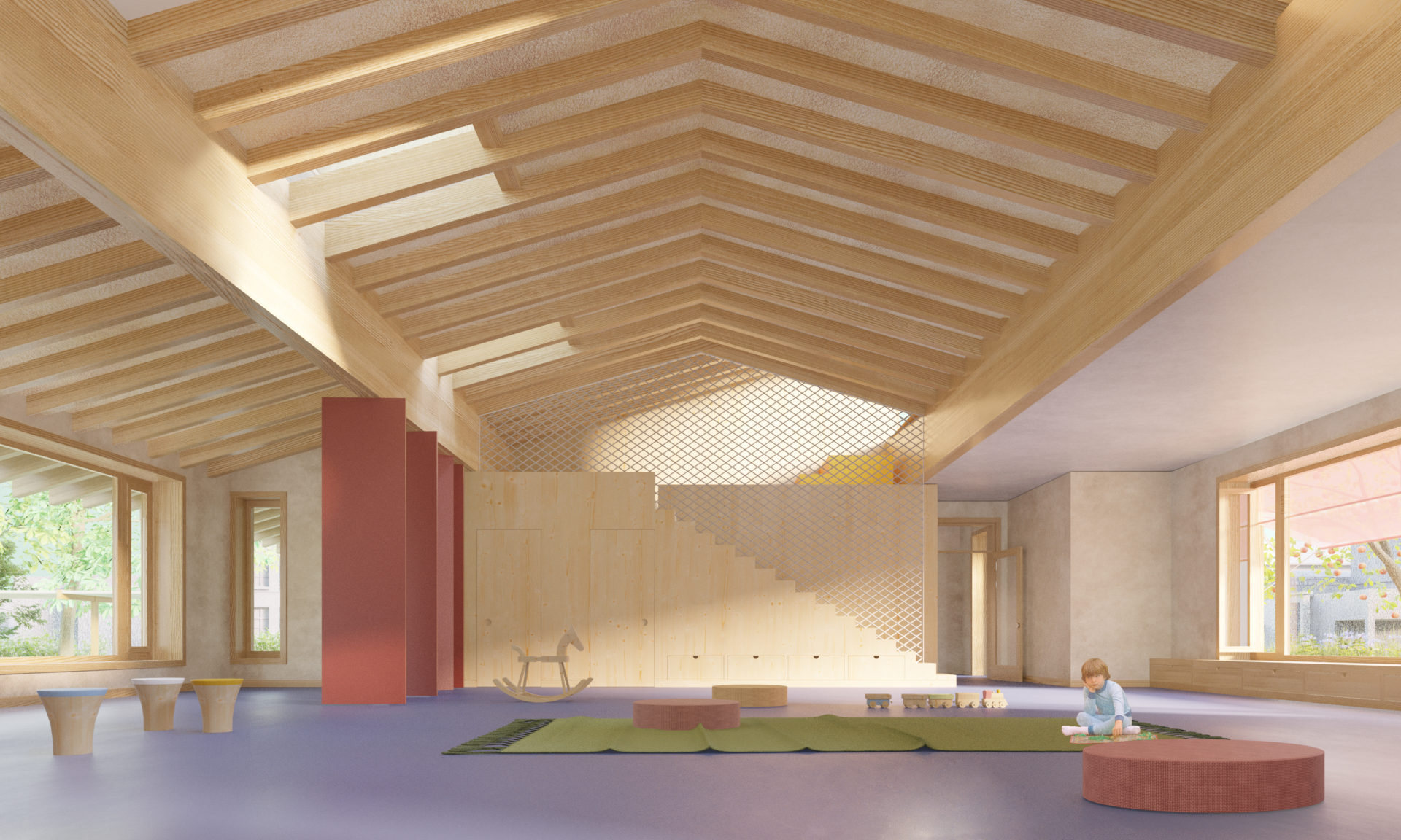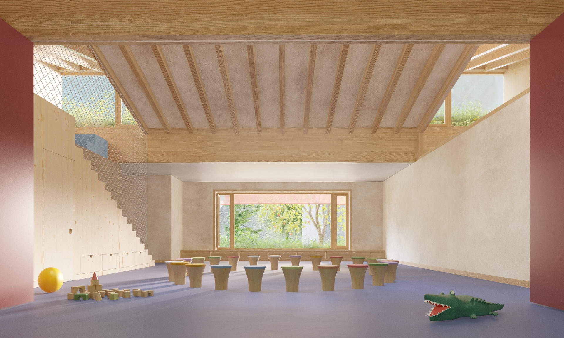 The roof is extensively greened and functions like a large “flowerpot,” with a meadow and insect hotels. The flowerpot symbolizes safe growth and nurturing care, until both plants and children are grown.
