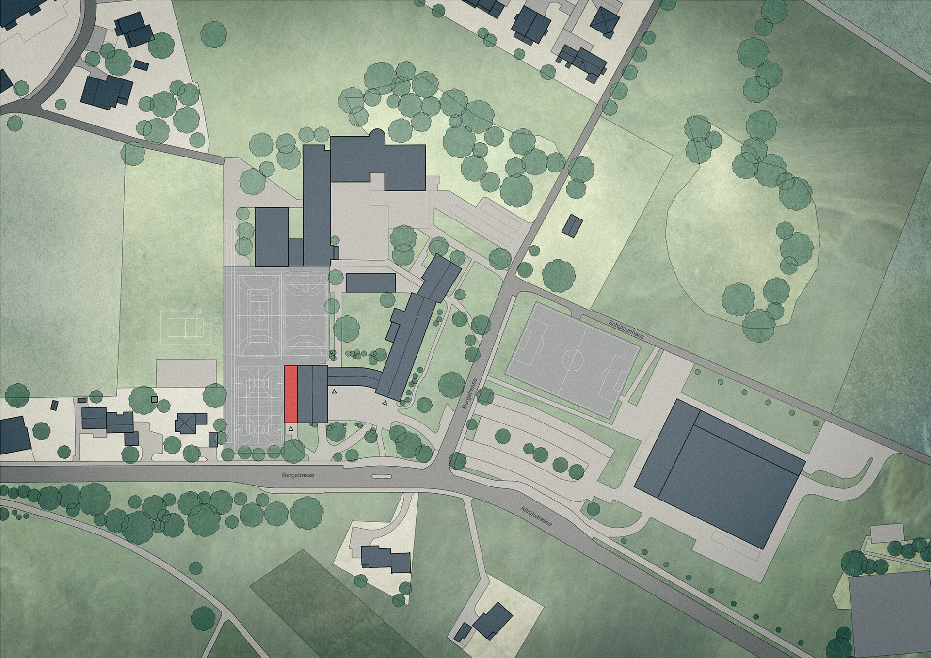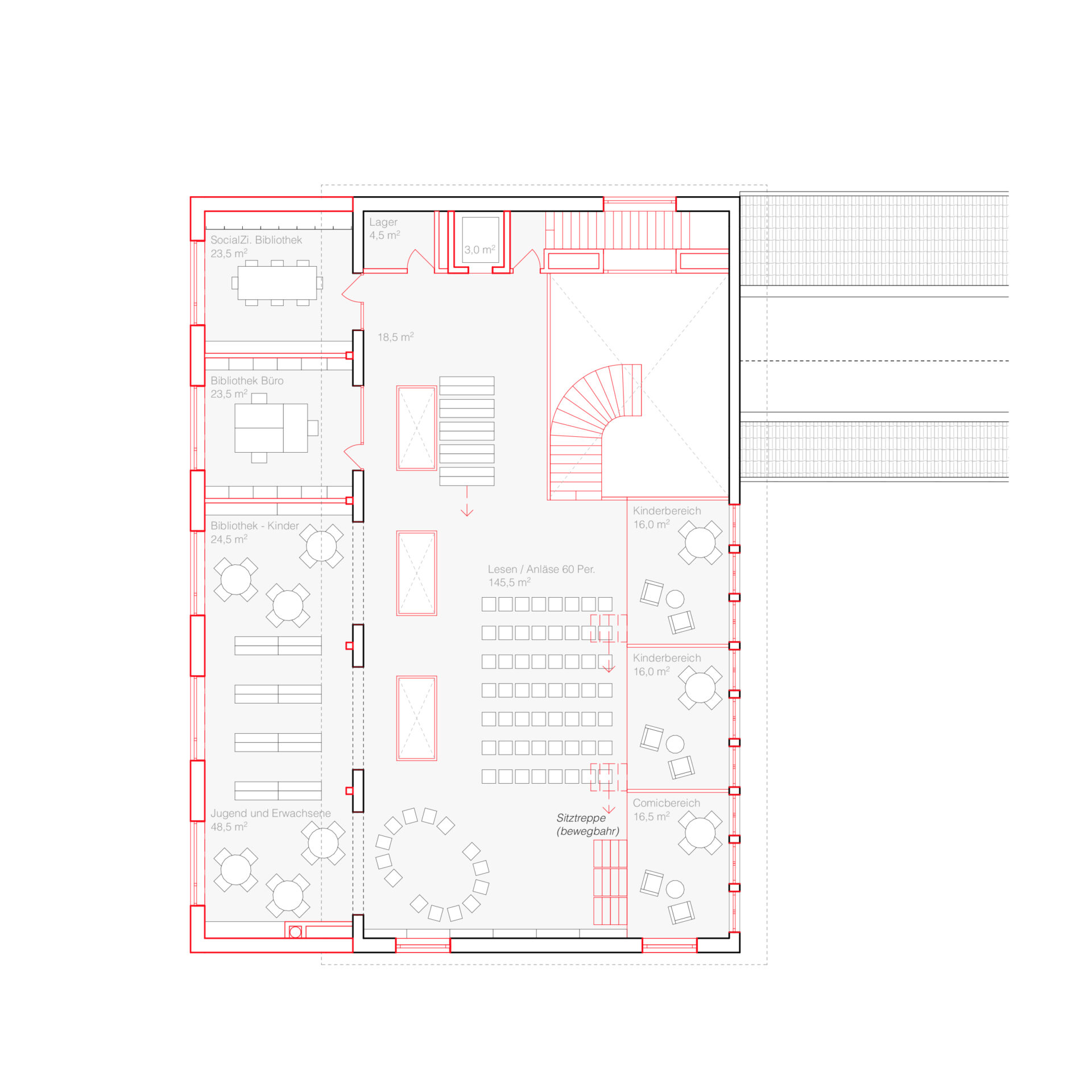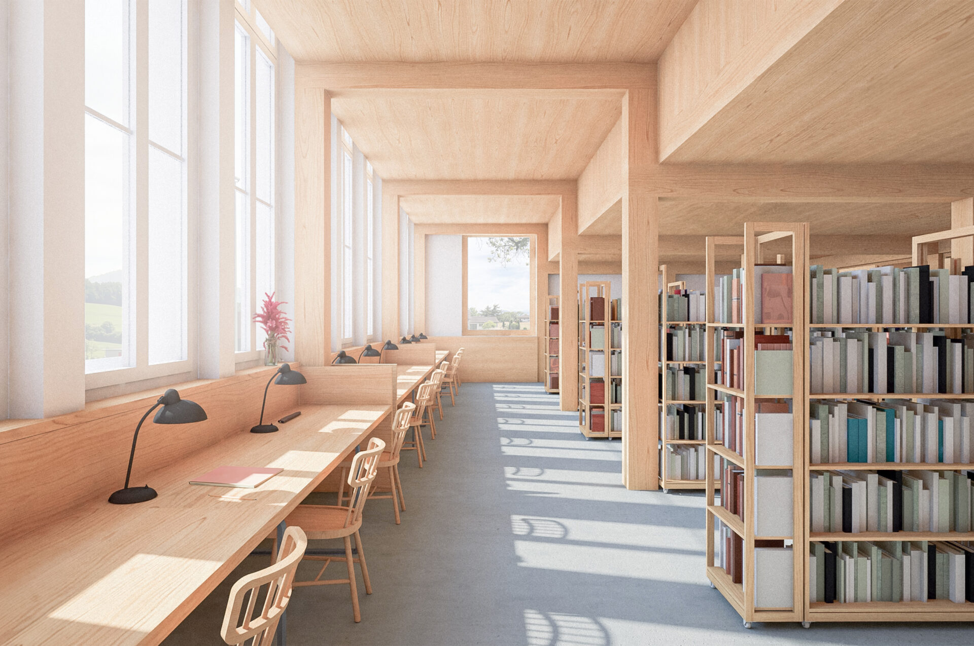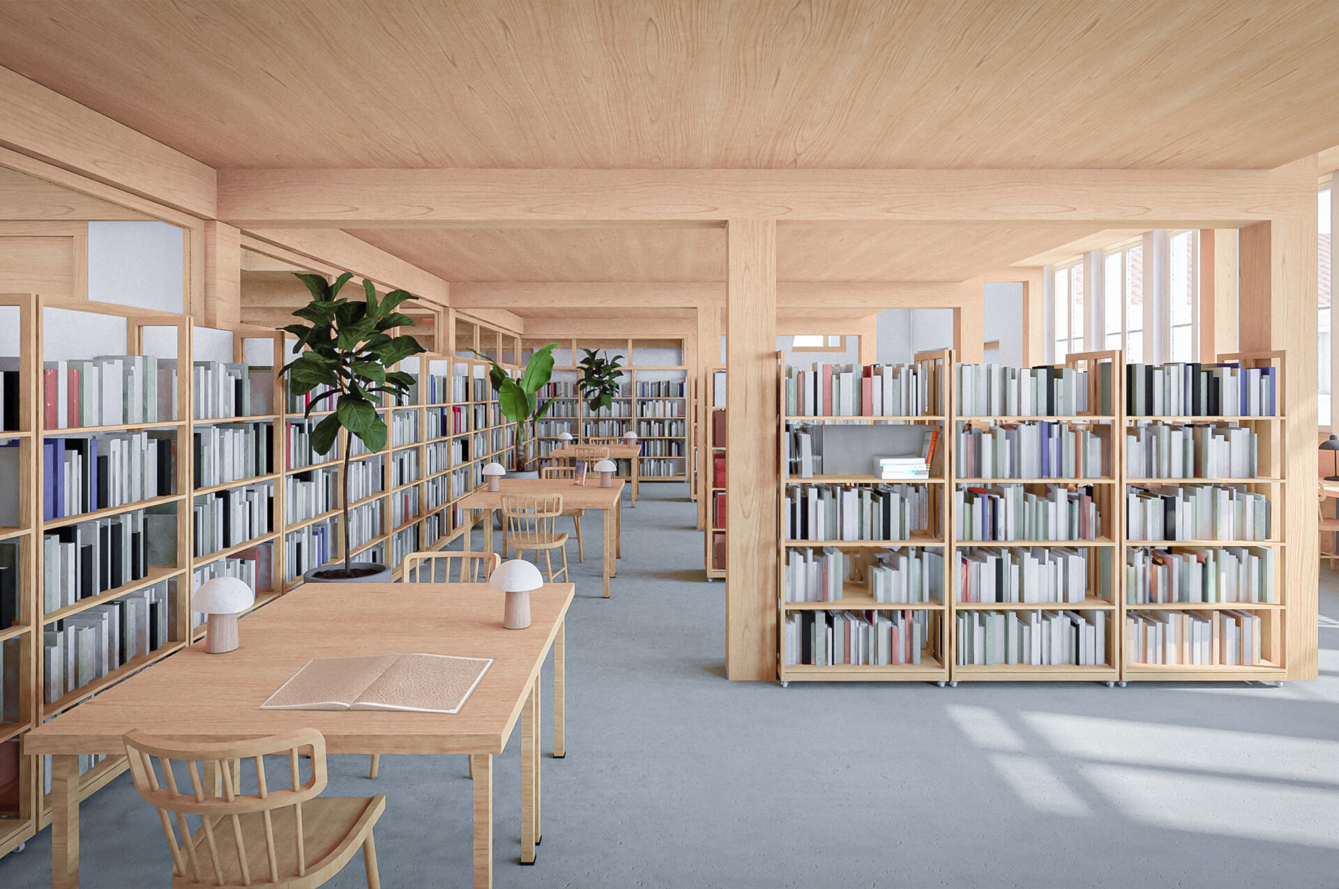 Transformation of a gymnasium at the primary school in Gossau for a new function: a municipal library with an independent area for the administration of the educational institution. The municipal library gains a new, larger location than the current one, allowing students to use it more conveniently due to its location in the school complex. In addition, the facility’s administration gains several new rooms that have been transformed from backrooms into functional office spaces.