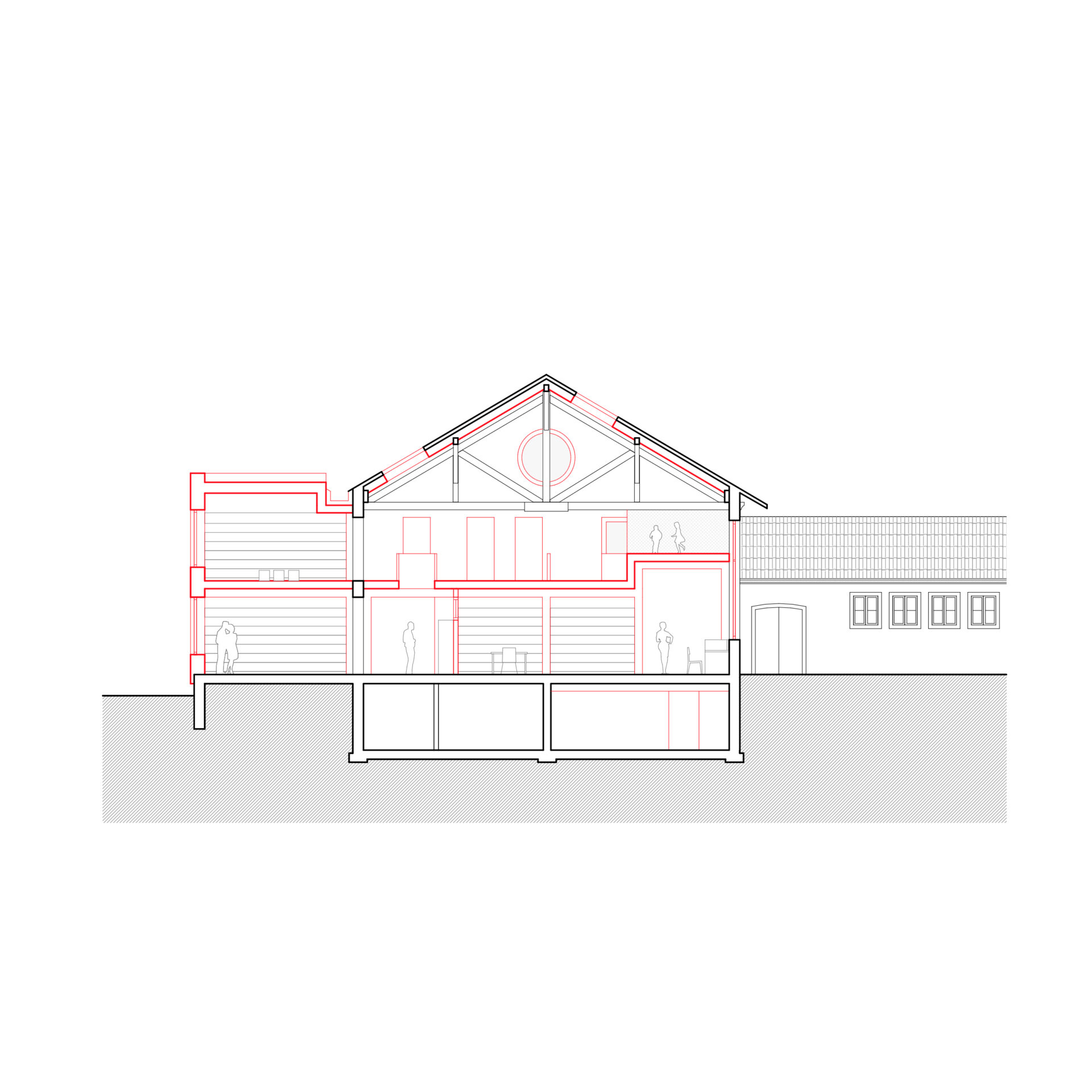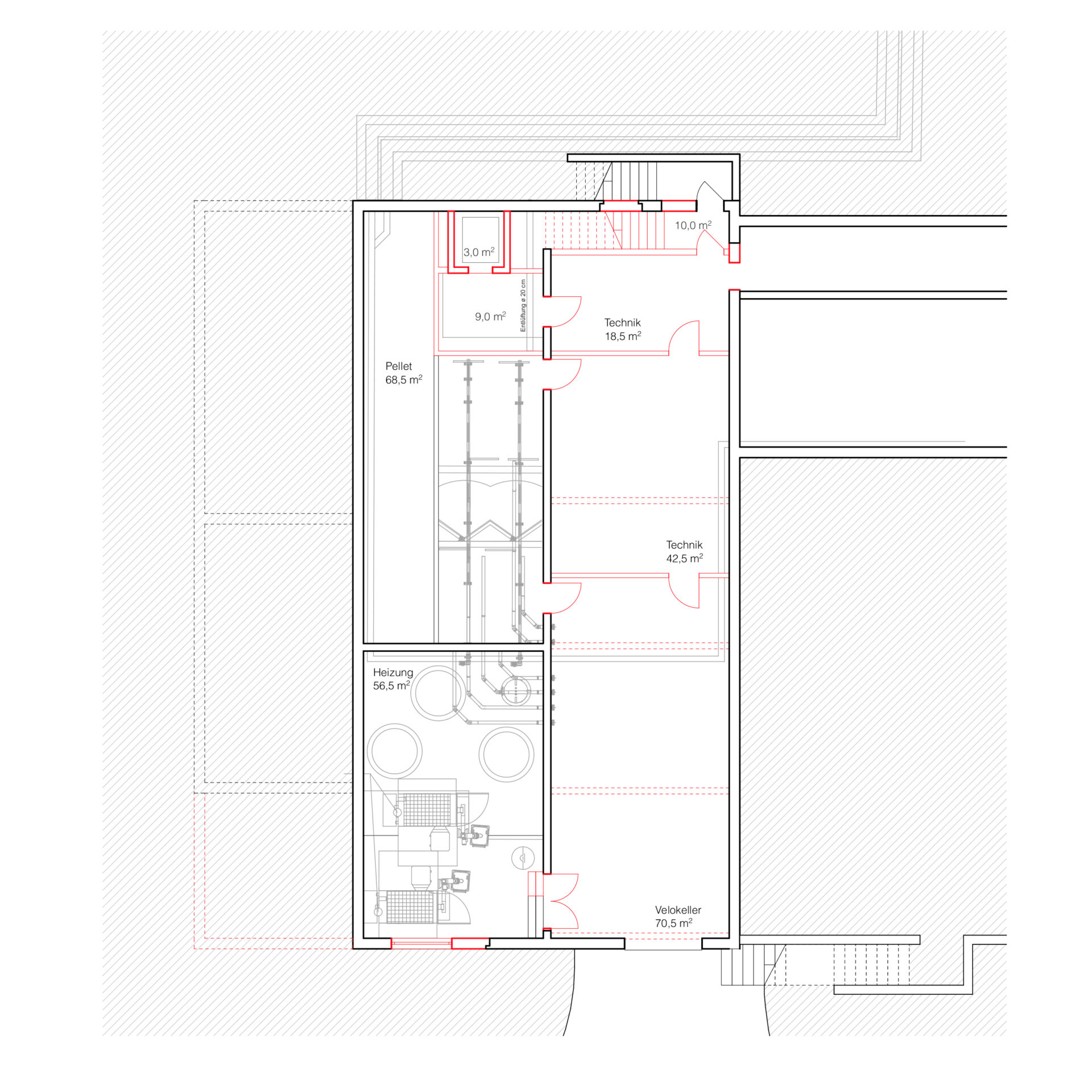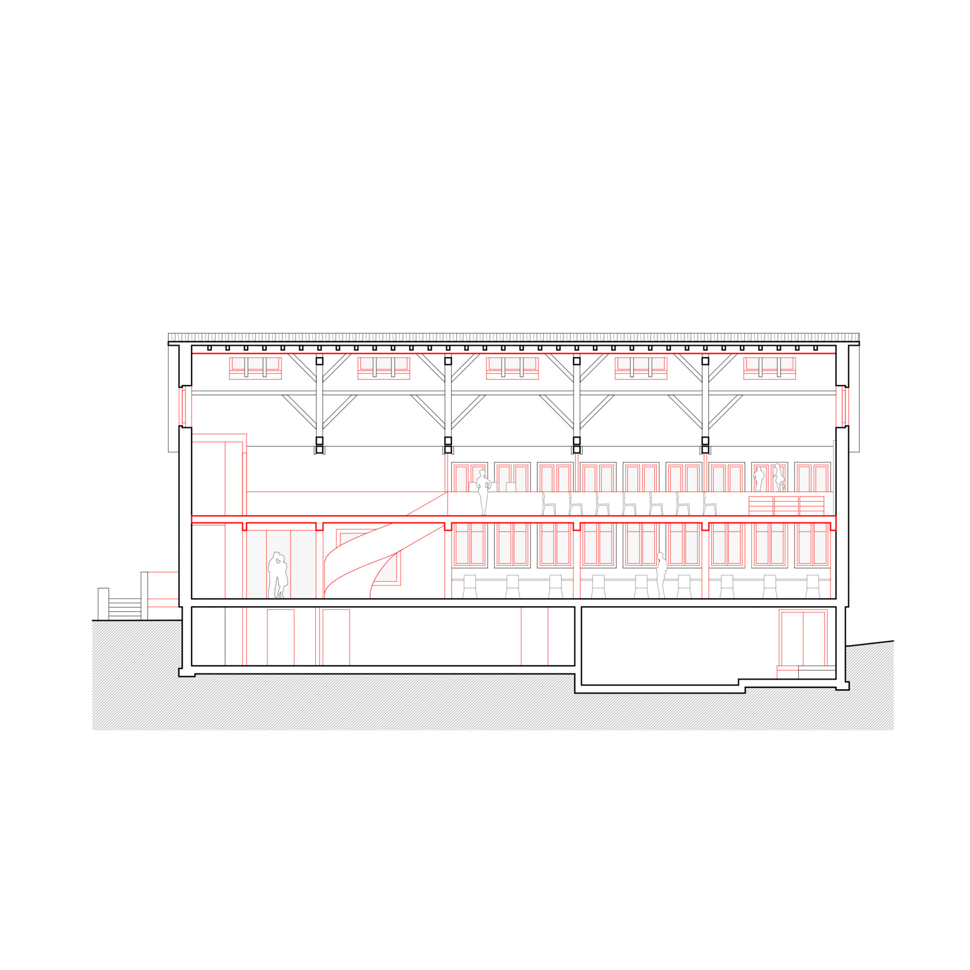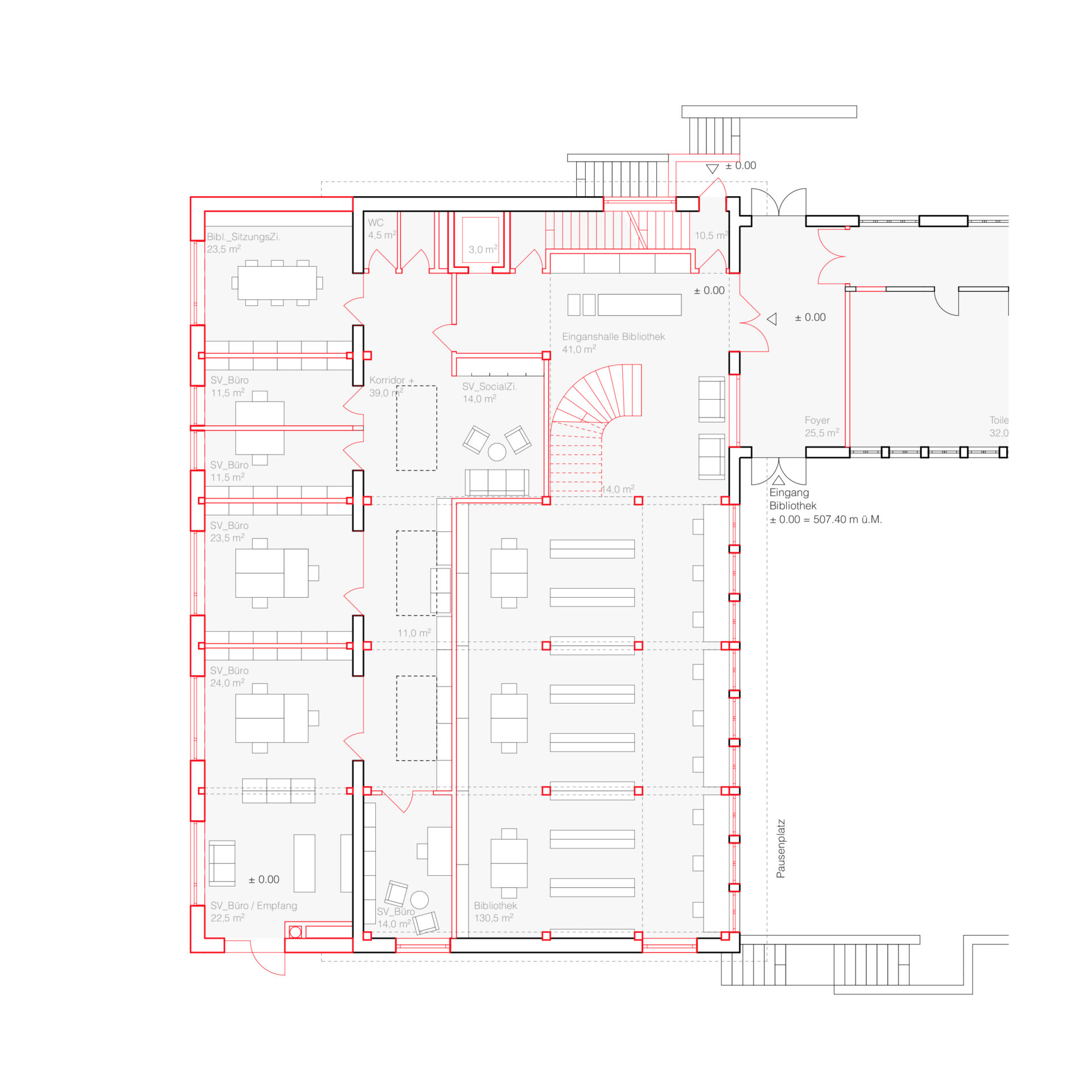 Transformation of a gymnasium at the primary school in Gossau for a new function: a municipal library with an independent area for the administration of the educational institution. The municipal library gains a new, larger location than the current one, allowing students to use it more conveniently due to its location in the school complex. In addition, the facility’s administration gains several new rooms that have been transformed from backrooms into functional office spaces.