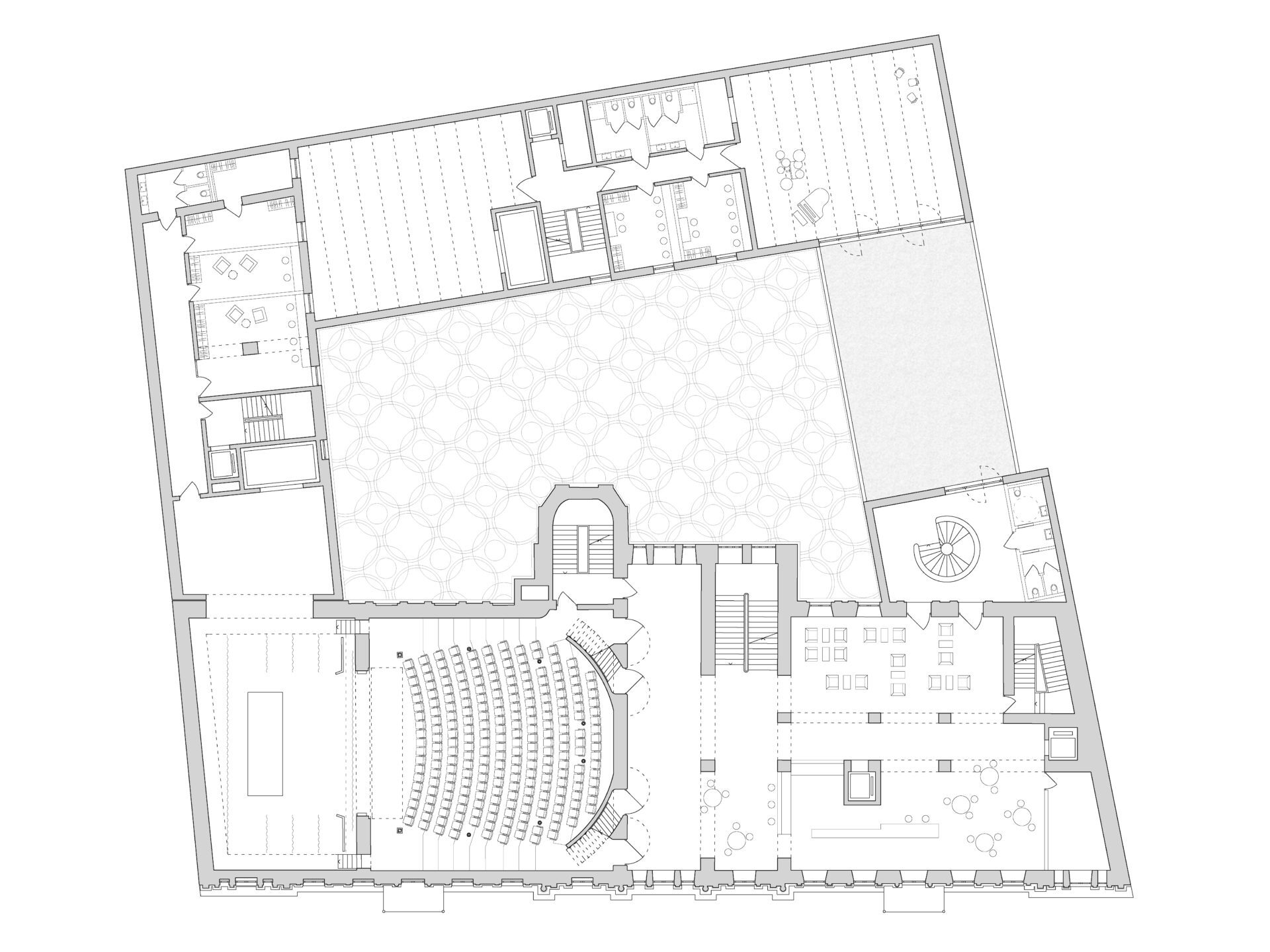 Als Ausgangspunkt des Projektes wird dessen bisher kaum exponierter Hof zum Mittelpunkt des neuen Kulturzentrums umgestaltet. Die auf zwei L-Formen basierende Bebauung staffelt sich ringsherum und bildet eine Abfolge von öffentlich bespielbaren Terrassen.